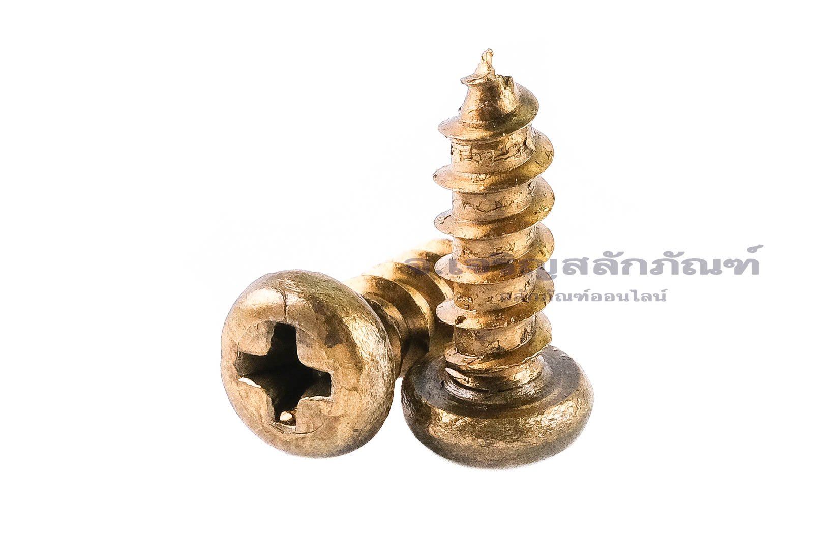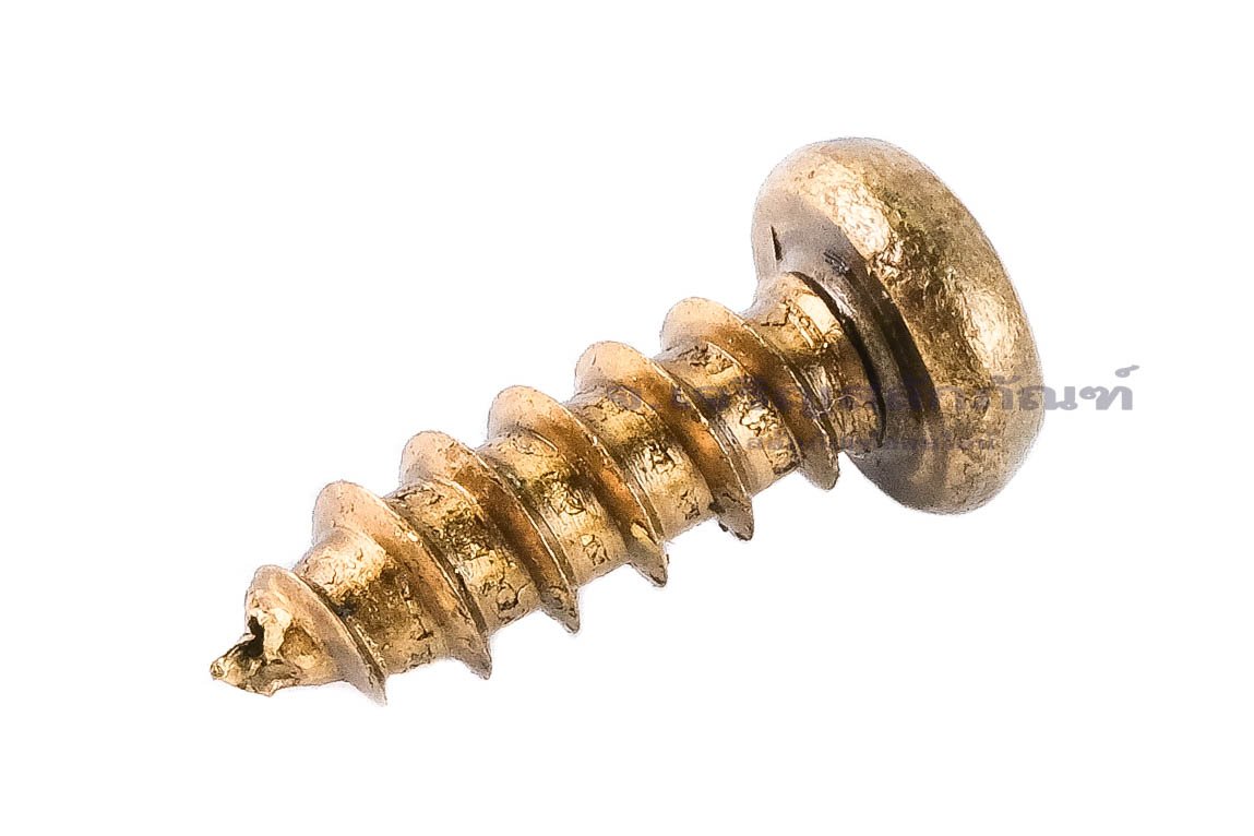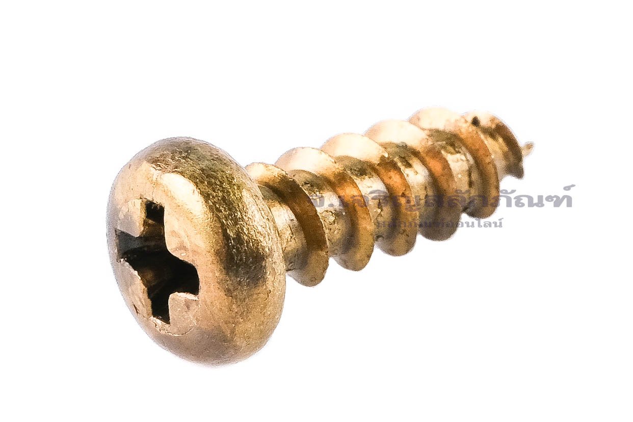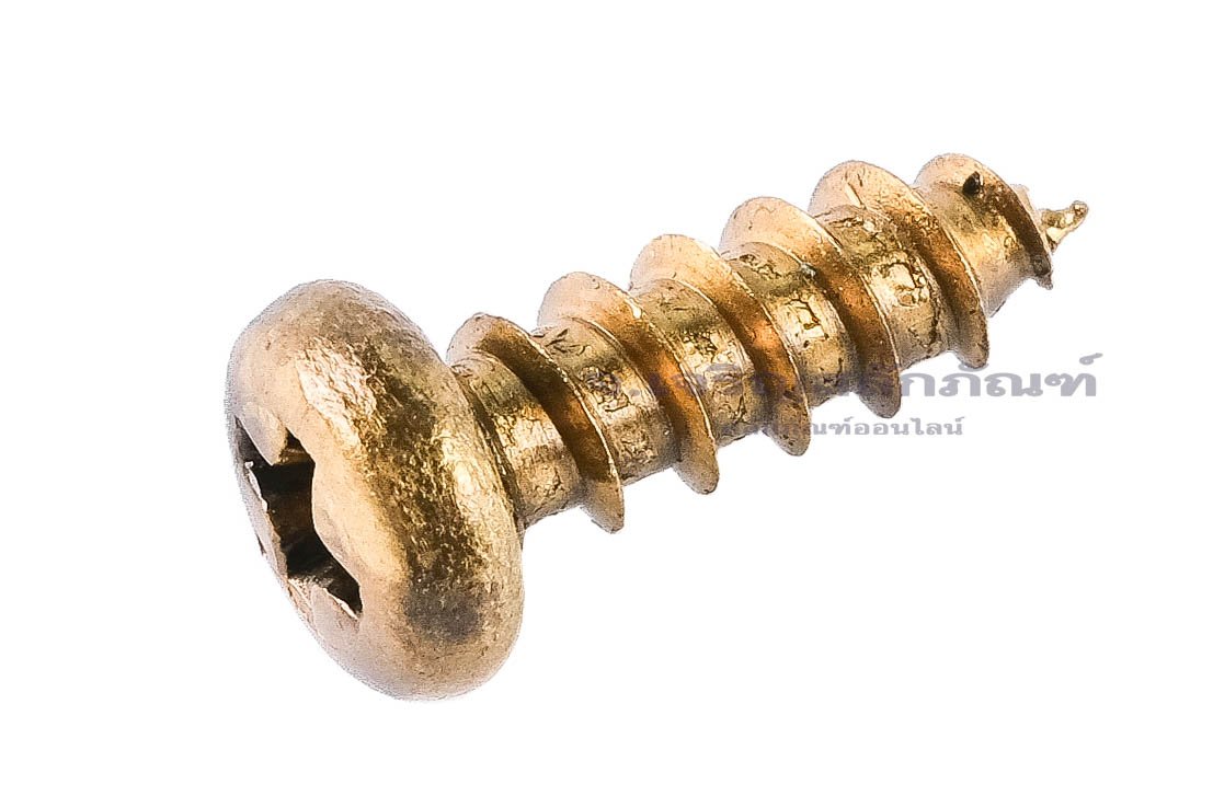 • เกรดคุณสมบัติของวัสดุ (Material Grade): Brass ทองเหลือง สีเหลืองทองเงา ไม่เป็นสนิม และทนต่อการกัดกร่อนได้ดีมาก สามารถเจาะเข้าเนื้อวัสดุอ่อน เช่น ไม้ พลาสติก หรือแผ่นโลหะบาง ๆ ได้ โดยไม่ต้องใช้พุกหรือน็อตตัวเมีย หัวกลมมีลักษณะนูน ใช้ไขควงแฉก (Phillips) ในการขัน