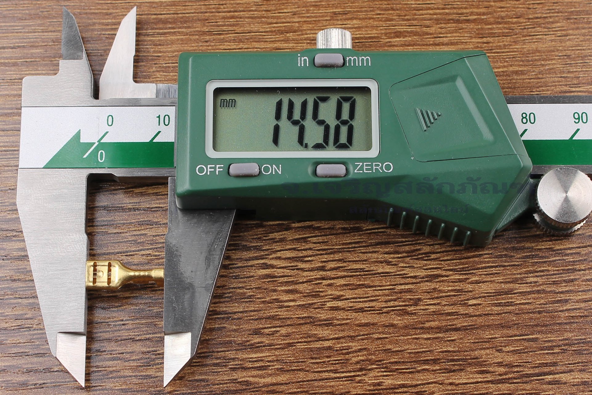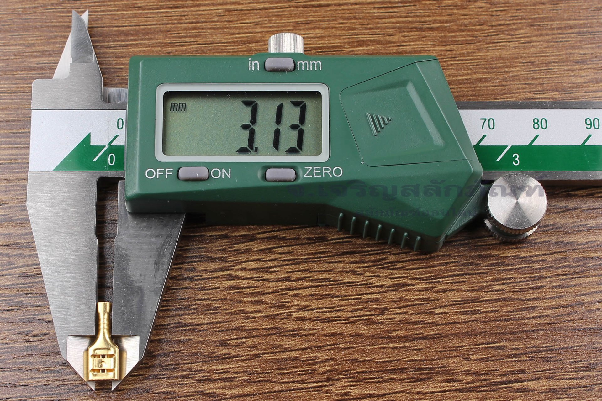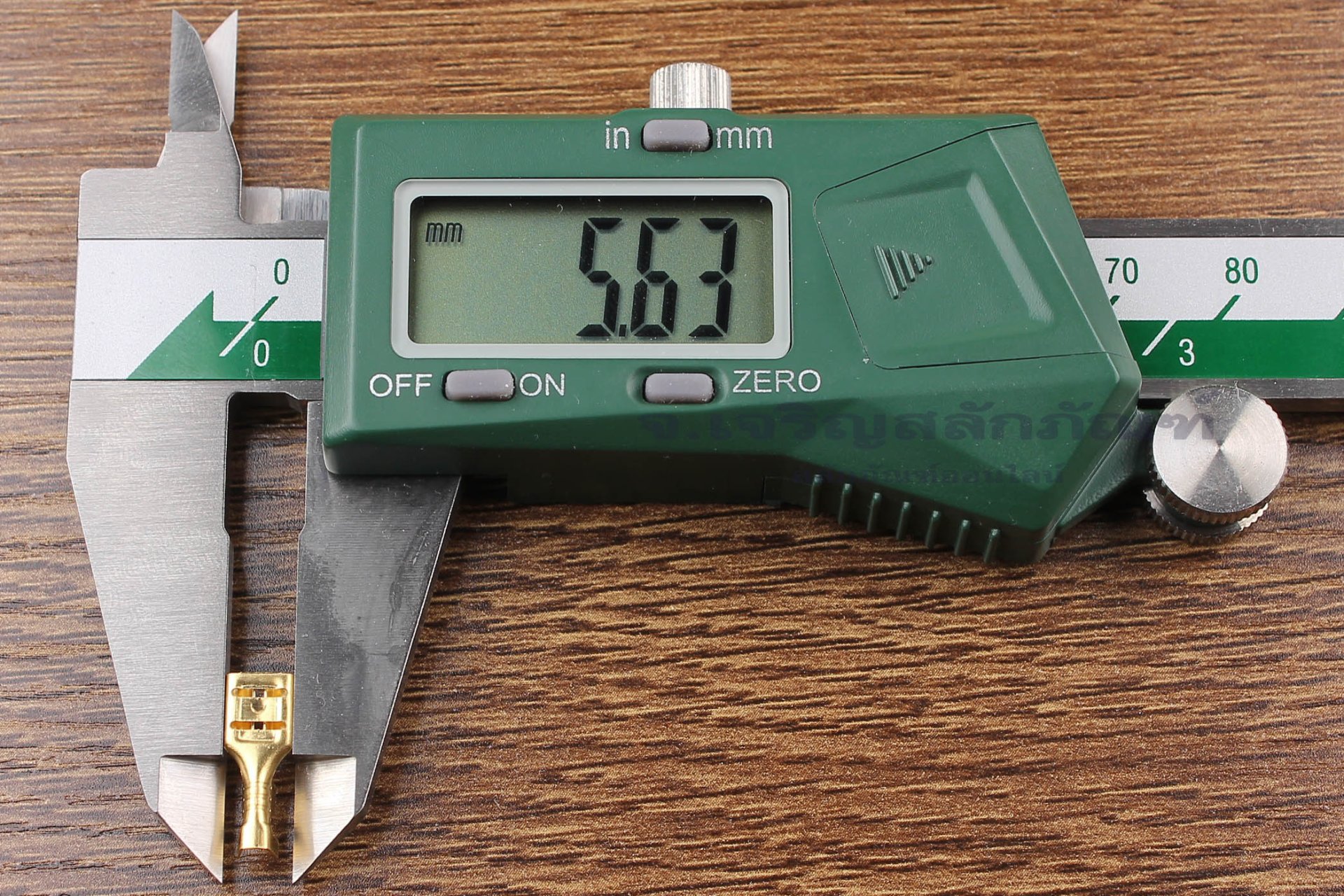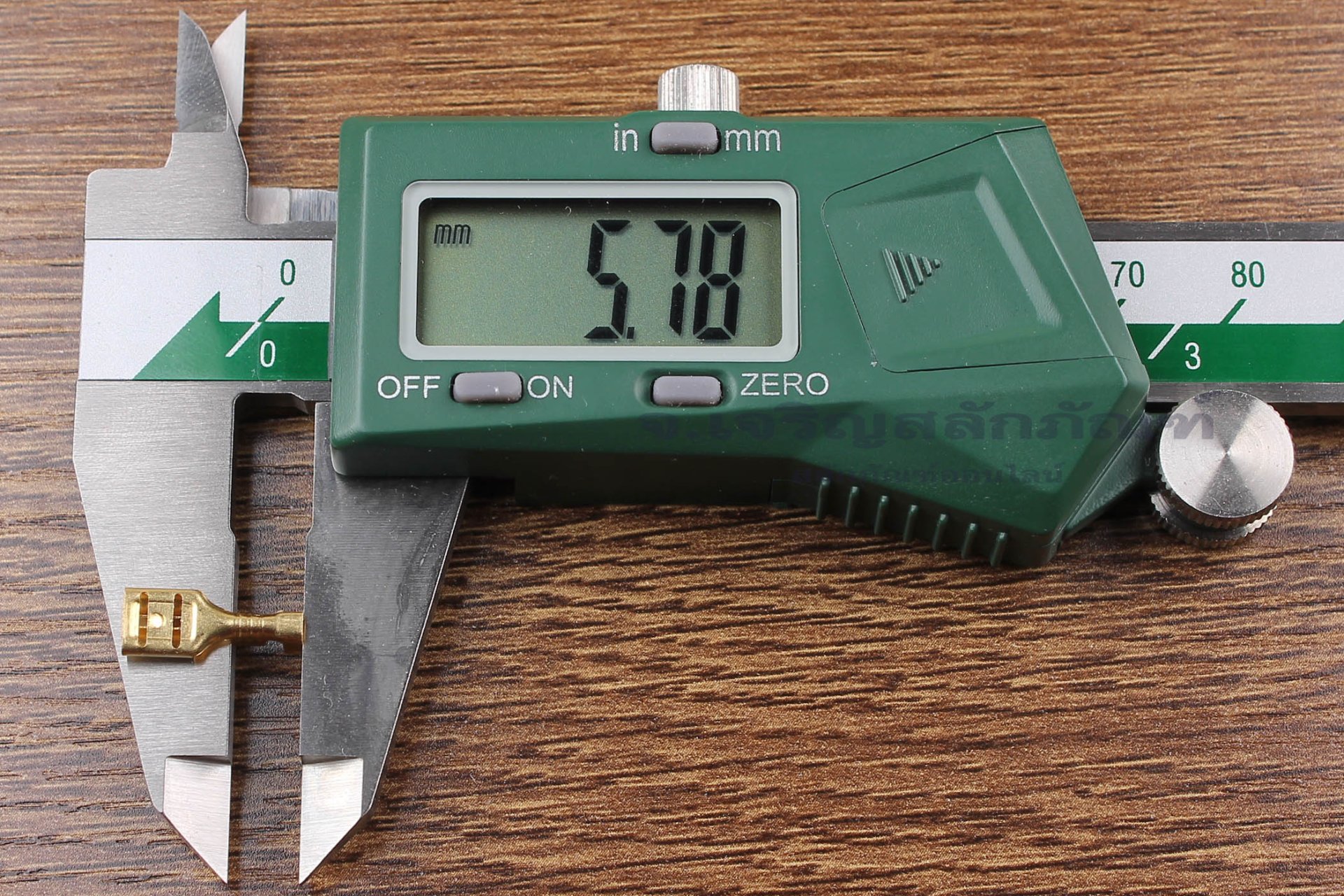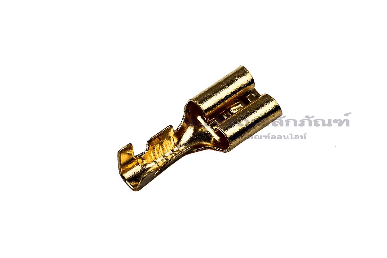 [E] หางปลาแบน เปลือย ทองเหลือง ตัวเมีย 4.8 mm ความกว้างหัวล็อก 5.6 mm ความกว้างแกนล็อกสายไฟ 2 mm ยาว 5.8 mm